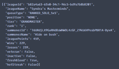 이렇게 불러온 소환사 닉네임을 통해서 Step1과 Step2를 숙지한 것처럼 그랜드마스터랭크의 소환사 고유 id(accountId)를 수집합니다.