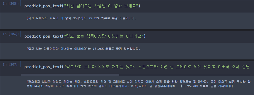 def predict_pos_text(text): token = tokenizing(text) #okt.pos로 토큰화한 단어를 정리 tf =term_frequency(token)#토큰화된 단어를 이용해서 가장 많이 등장하는 단어와의 빈도수 체크 data = np.expand_dims(np.asarray(tf).astype('float32'), axis=0) #data는 그럼 입력받는 text가 한 문장만 받기 때문에 가장 바깥 리스트의 요소 갯수는 1이 될 것이고 #마찬가지로 리스트 안 리스트 요소내의 갯수는 10000개가 될 것이다. #np.expand_dims?? score = float(model.predict(data)) #새로운 데이터를 받으면 결과 예측 if(score > 0.5): print("[{}]는 {:.2f}% 확률로 긍정 리뷰입니다.\n".format(text, score * 100)) else: print("[{}]는 {:.2f}% 확률로 부정 리뷰입니다.\n".format(text, (1 - score) * 100))새로운 데이터 입력에 따른 모델의 예측 결과