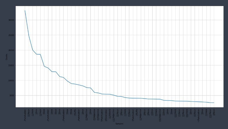 #위에서 만든 데아터에서 긍/부정을 제외하고 token에 넣어준다. [[a],b] 에서 a만 넣는다고 생각하면 됨 tokens = [t for d in train_pos for t in d[0]] import nltk text = nltk.Text(tokens,name='NMSC')#nltk라이브러리를 통해서 텍스트 데이터 나열 len(set(text.tokens))#35425개의 고유 텍스트가 존재 text.vocab().most_common(10) #vocab().most_common(10) - 텍스트 빈도 상위 10개 보여주기 즉, count_values()를 통해서 내림차순한 것과 같습니다.자 그럼 위 코드를 통해서 만든 빈도 상위 50개 단어를 시각화 해보도록 하겠습니다.