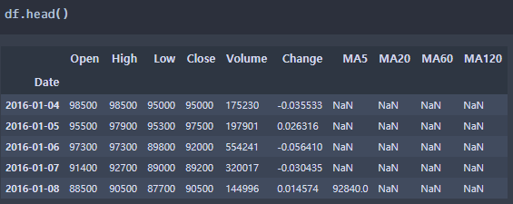 ma5 = df['Close'].rolling(window=5).mean() #5일 주가이동평균선 구하는 법 #.rolling(window=n) - n은 n일 주가이동평균선을 뜻하며 위의 코드는 5일동안의 주가를 각 날짜마다 묶어주는 것입니다. #.mean() - 묶인 n일 만큼의 데이터를 산술평균하라는 명령어 df['MA5'] = ma5 #구한 5일 주가이동평균한 데이터를 "MA5"라는 새로운 변수로 넣어줍니다.마찬가지로 20일, 60일, 120일의 이동평균선을 구해보겠습니다.
