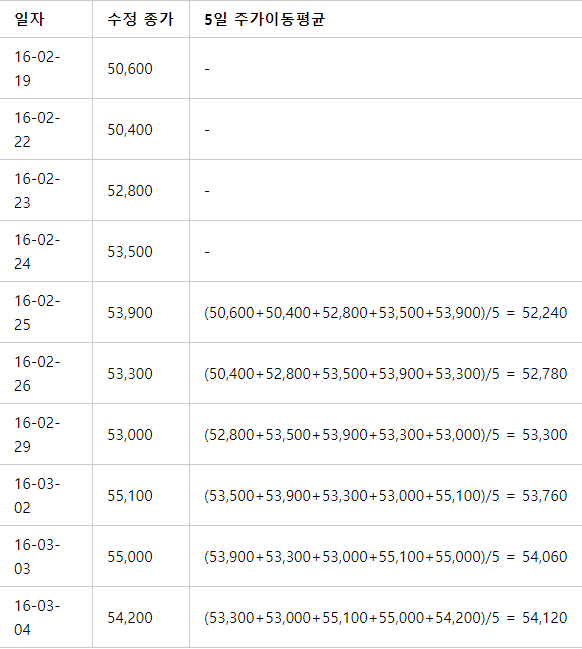5일 주가이동평균을 구하는 공식을 통해서 예를 들어 보겠습니다.(간단한 산술평균)
