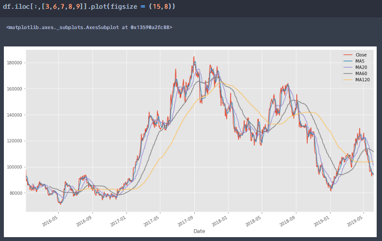 ma_ls = [20,60,120] for i in range(len(ma_ls)): a = df['Close'].rolling(window=ma_ls[i]).mean() df['MA'+str(ma_ls[i])] = a