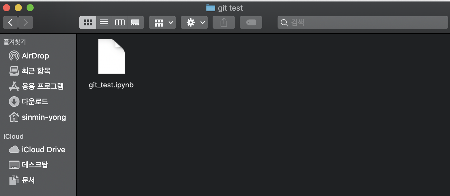 해당 폴더에는 git_test.ipynb라는 파일이 있습니다. 그럼 우리의 목적은 이제 저 파일을 관리하는데 있어서 오픈소스인 git과 연동하여 관리해보고자 하는 것이므로 해당 파일을 git에 올리는 작업을 해야겠죠?