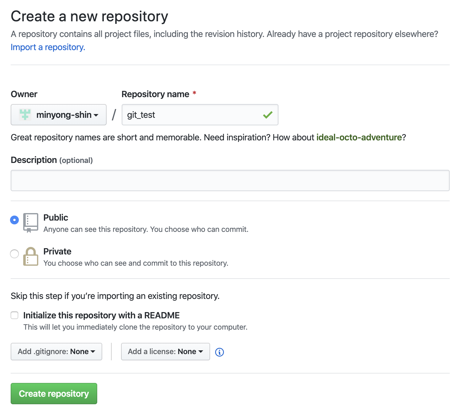 README는 연동 후에 추가 가능하니 화면에 보이는 그대로 create repository를 클릭하여 다음 화면으로 진입합니다.