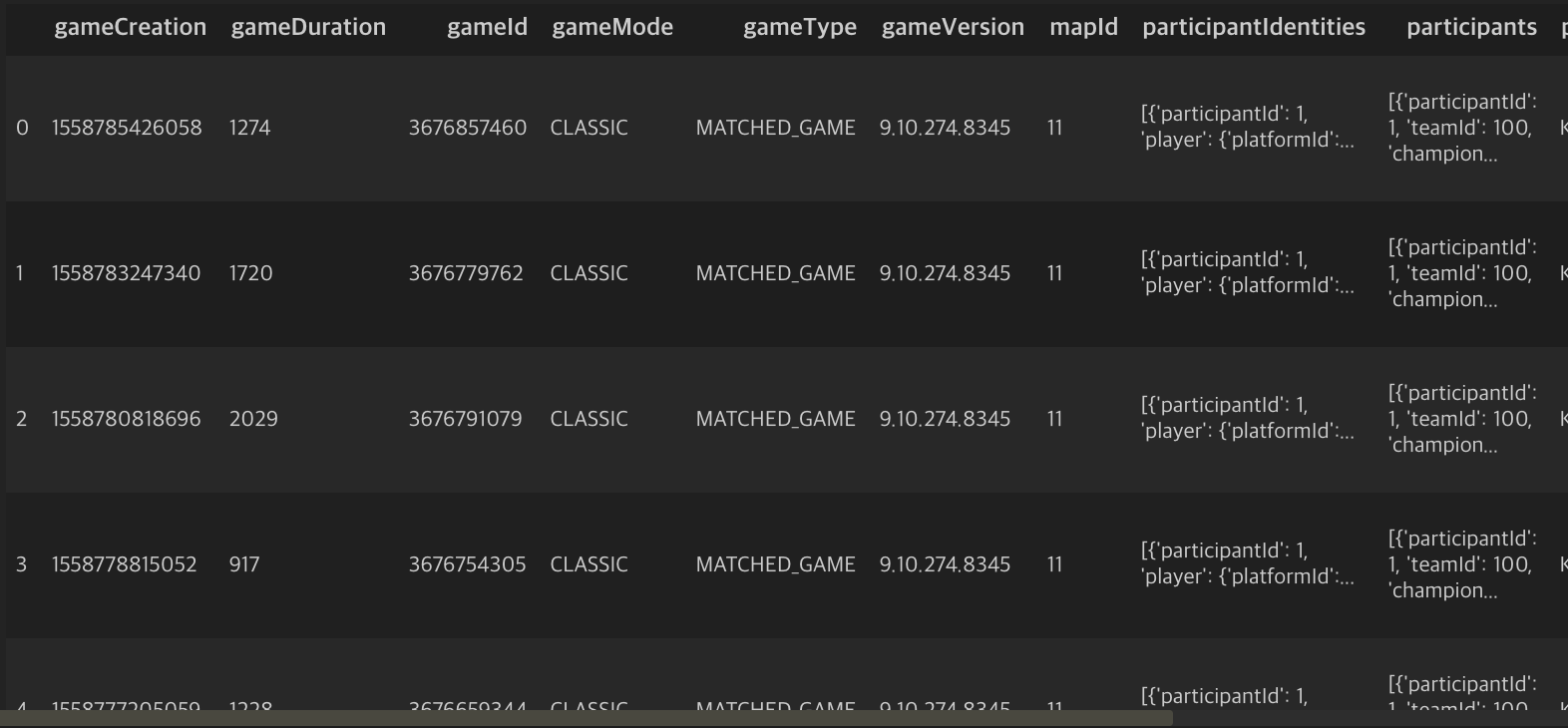 이전 포스팅에서 수집한 매치데이터를 이용하여 팀의 승/패를 예측해보겠습니다. 다들 teams 변수를 이용하여 데이터프레임화를 했던 것을 기억하시나요. teams데이터는 리스트안에 딕셔너리가 있는 구조로써 dict..