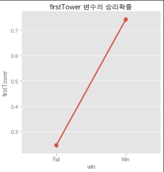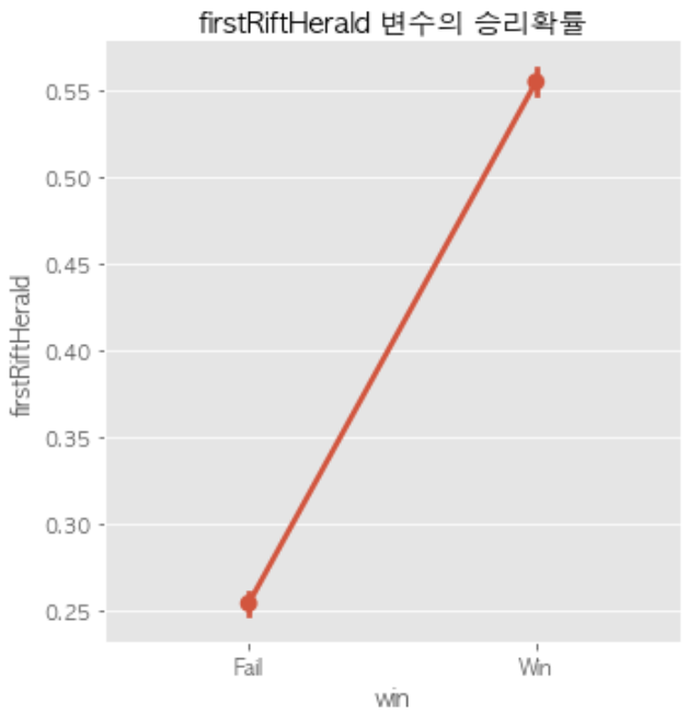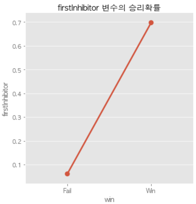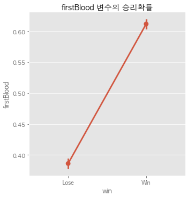 def first_valid_visualize(df,target,variable): sns.factorplot(target,variable,data=df) plt.title(variable+' 변수의 승리확률') #plt.xticks(df[target]) plt.show()시각화에 앞서 시각화 함수를 만들어줍니다. factorplot은 어떤 종속변수에 대하여 연속형 변수나 정수형변수의 확률값을 알려줍니다.