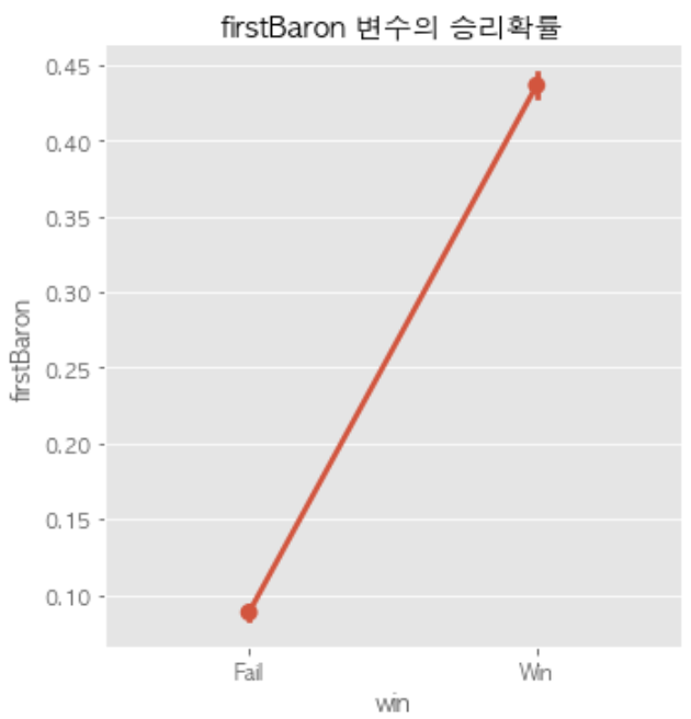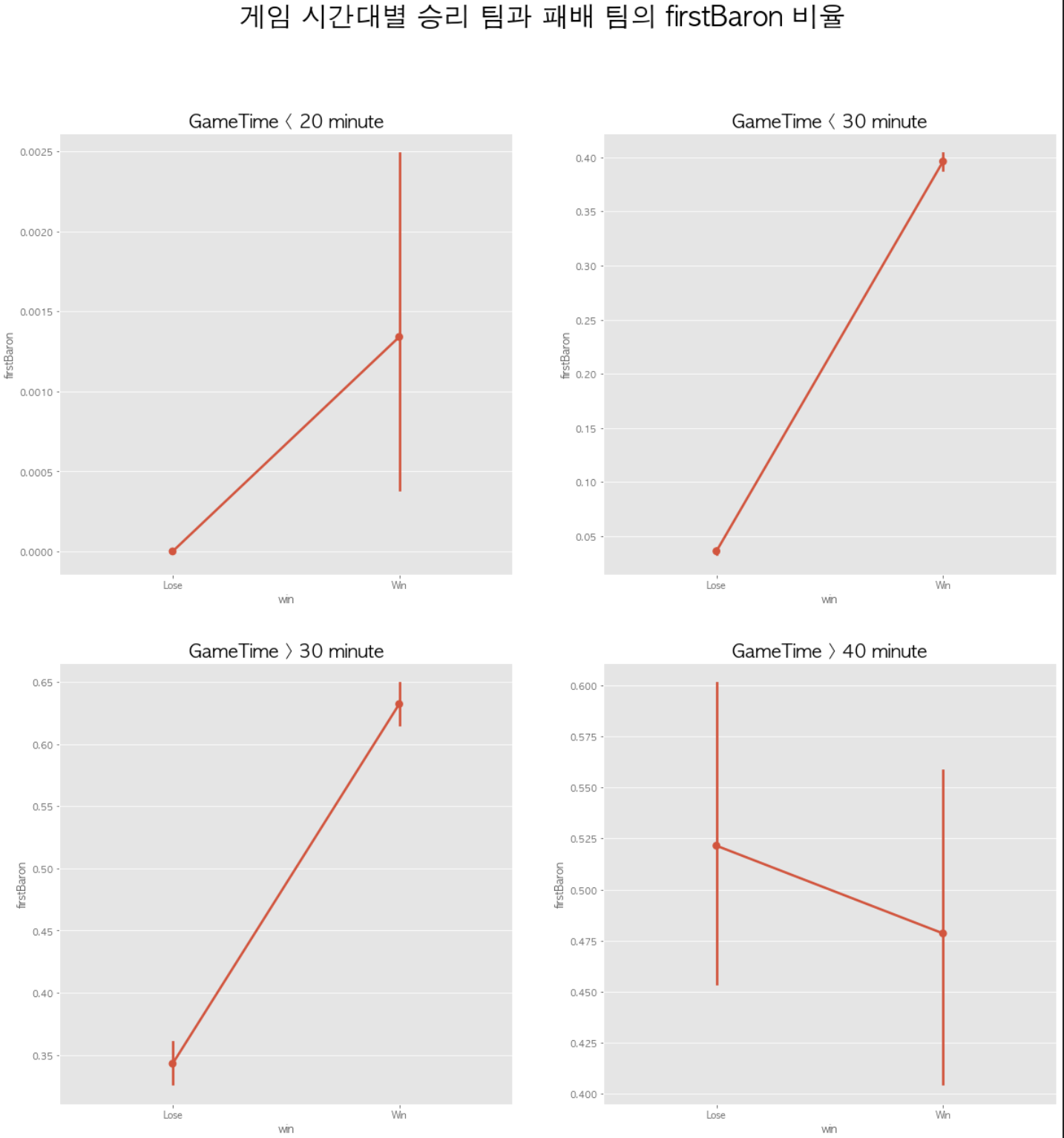 첫 바론 또한 승리한 팀이 패배한 팀보다 약 30%p 높아 승리에 중요한 요소임을 알 수 있습니다.