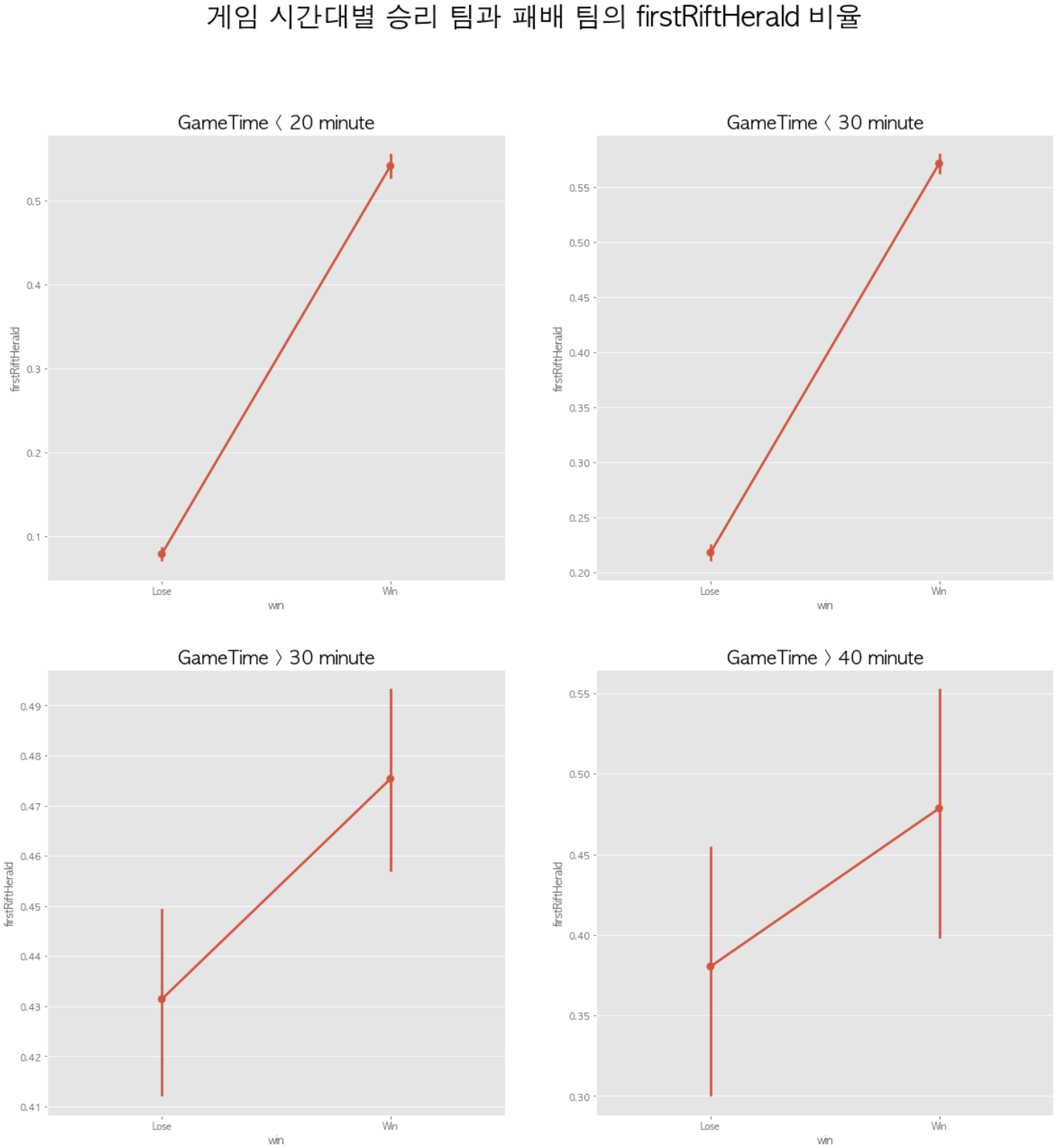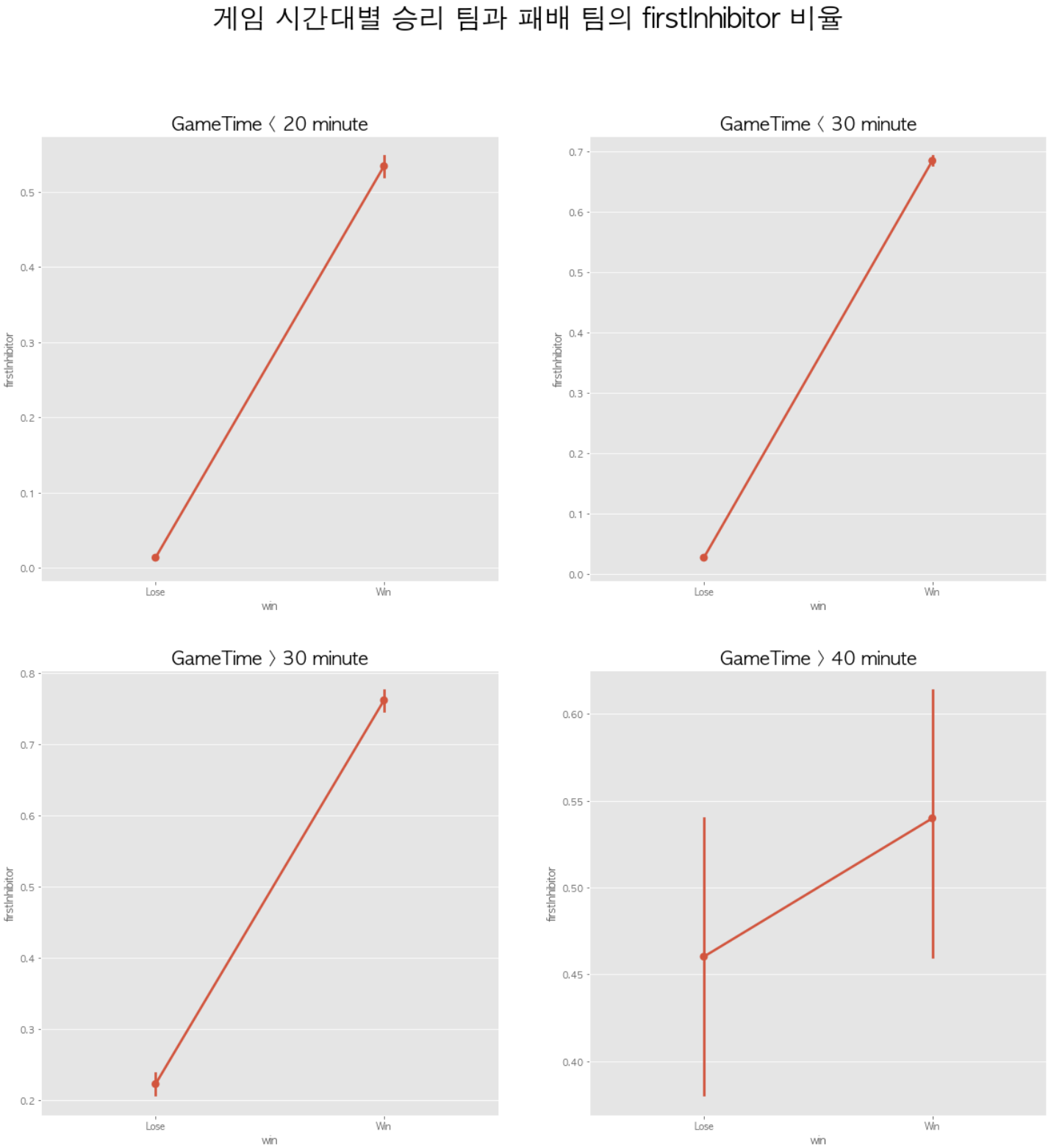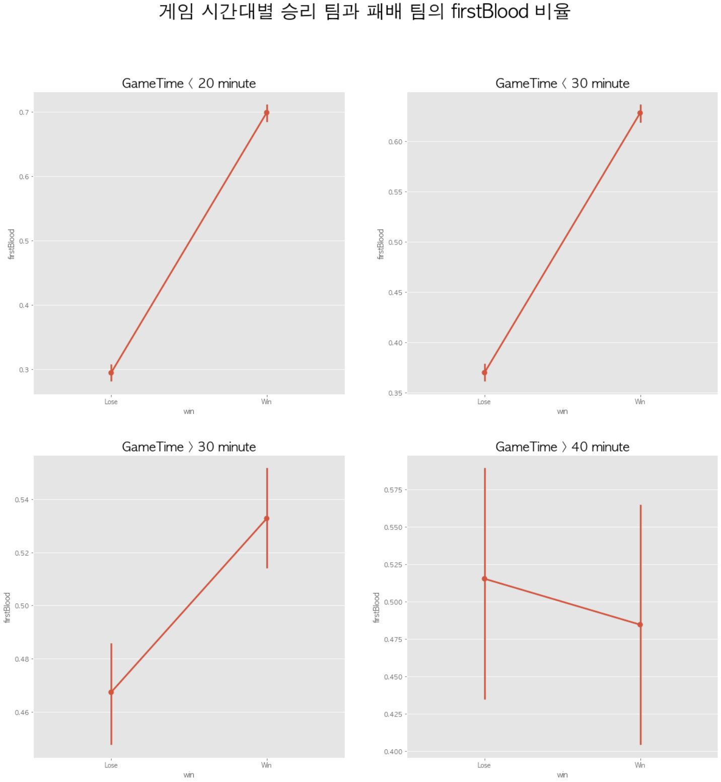 def first_time_ratio(target,variable): global game_part1, game_part2, game_part3, game_part4 fig = plt.figure(figsize=(20,20)) fig.suptitle('게임 시간대별 승리 팀과 패배 팀의 ' + variable + ' 비율',size = 30) ax1 = fig.add_subplot(221) ax2 = fig.add_subplot(222) ax3 = fig.add_subplot(223) ax4 = fig.add_subplot(224) ax1.set_title('GameTime < 20 minute',size = 20) ax2.set_title('GameTime < 30 minute',size = 20) ax3.set_title('GameTime > 30 minute',size = 20) ax4.set_title('GameTime > 40 minute',size = 20) sns.factorplot(target,variable,data=game_part4,ax=ax1) #plt.title(variable+' 변수의 승리확률(GameTime < 20 minute)') #plt.show() sns.factorplot(target,variable,data=game_part3,ax=ax2) #plt.title(variable+' 변수의 승리확률(GameTime < 30 minute)') #plt.show() sns.factorplot(target,variable,data=game_part1,ax=ax3) #plt.title(variable+' 변수의 승리확률(GameTime >= 30 minute)') #plt.xticks(df[target]) #plt.show() sns.factorplot(target,variable,data=game_part2,ax=ax4) #plt.title(variable+' 변수의 승리확률(GameTime >= 40 minute)') #plt.xticks(df[target]) #plt.show() #plt.close(g.fig) #plt.show()그 다음 이에 관한 시각화 코드를 작성했습니다. 해당 코드는 각 게임 시간별 데이터를 위의 시각화와 똑같이 factorplot으로 표현했습니다.