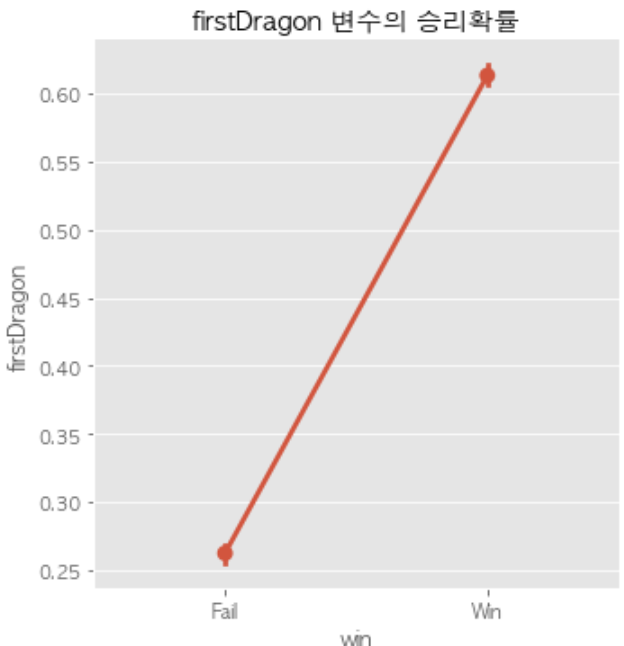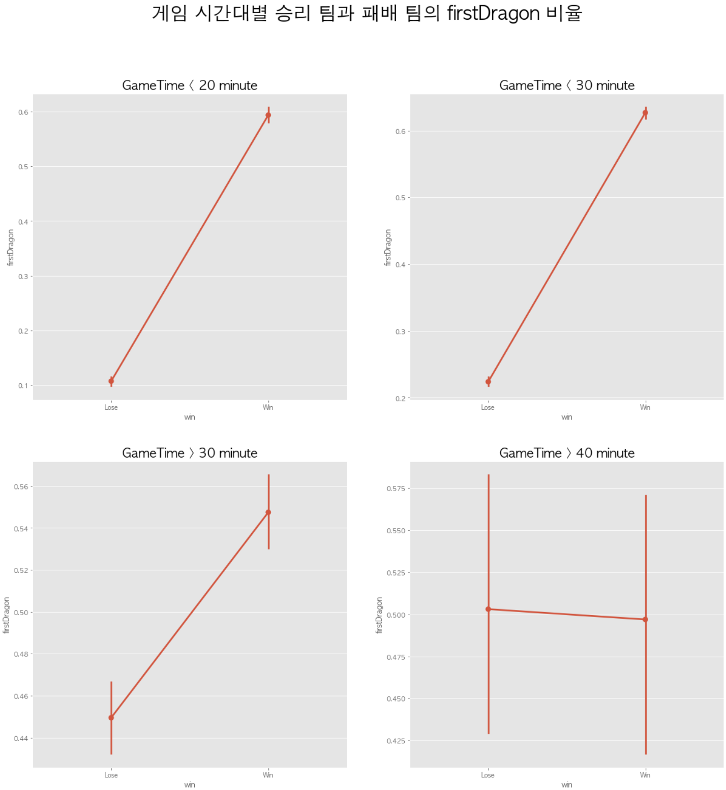 첫 드래곤 역시 먹은 팀이 유리한 상황을 가져가지만 시간이 긴 게임일수록 점점 큰 영향을 미치지 않는 것을 확인할 수 있습니다.