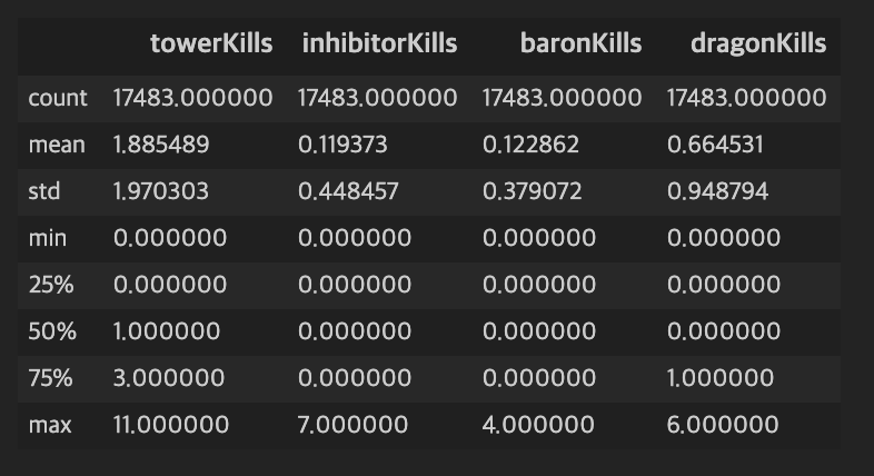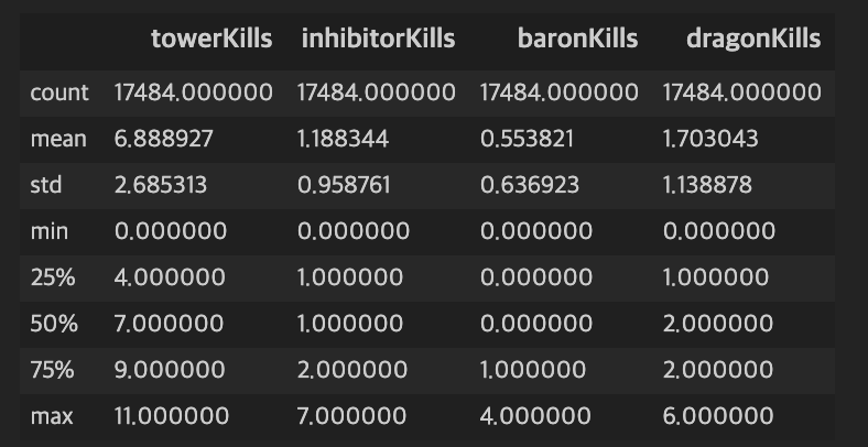 승리팀의 통계치 game_df[game_df['win']=='Lose'].describe()[['towerKills','inhibitorKills','baronKills','dragonKills']]