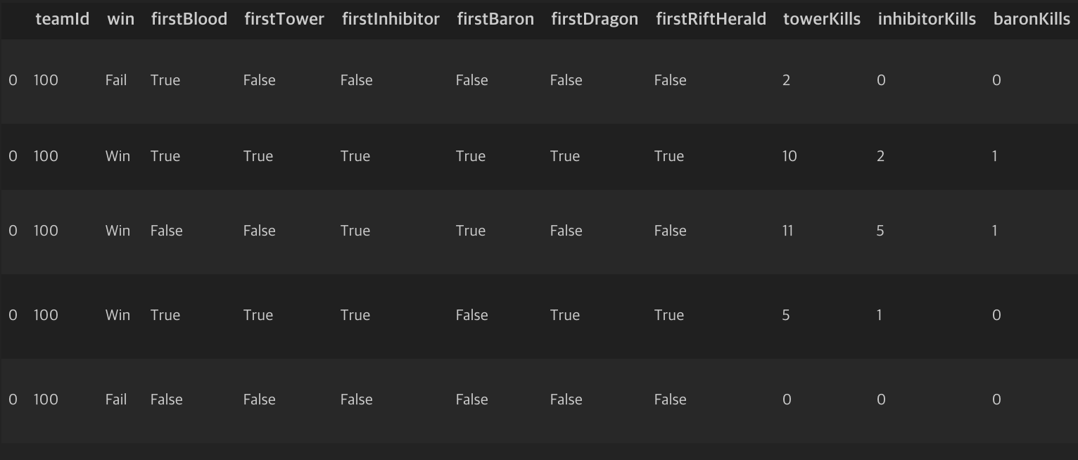 game_df = pd.concat([team_a,team_b],axis=0) game_df.head()음 제가 저번 포스팅에서 실수한 것이 있었는데 승패를 예측할 때 team_a나 team_b의 데이터 둘중에 하나만 가지고 학습을 시키고 승/패 예측을 했었습니다. 하지만 그럴 필요가 없었던 것이 사실 A팀과 B팀의 데이터는 달라서 두 팀의 데이터를 행결합하여 더 많은 데이터로 학습을 시켜 예측해서 결과의 신뢰성을 좀 더 높일 수 있었습니다. 약간의 아쉬움이...