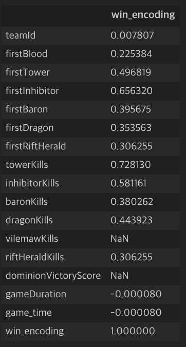 아마 리그오브레전드를 많이 해보신 분들이라면 위의 상관성에 대한 Domain Knowledge가 있기 때문에 편할텐데 리그오브레전드를 해보지 않으신분들은 왜 저 승패와의 상관계수가 저렇게 나오는지 의아하실텐데 리그오브레전드라는 게임은 포탑, 억제기 부시는 게임이라고 이해하시면 편할 듯 합니다.
