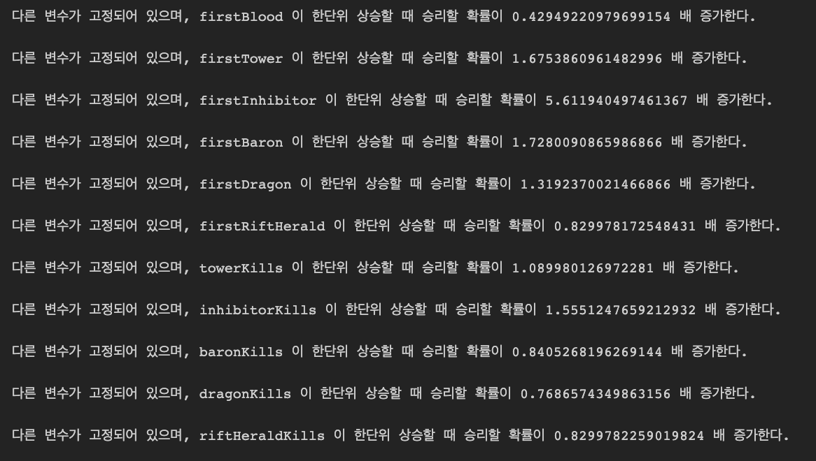for i in range(len(result.params)): print('다른 변수가 고정되어 있으며, {} 이 한단위 상승할 때 승리할 확률이 {} 배 증가한다.\n'.format(result.params.keys()[i],np.exp(result.params.values[i])))