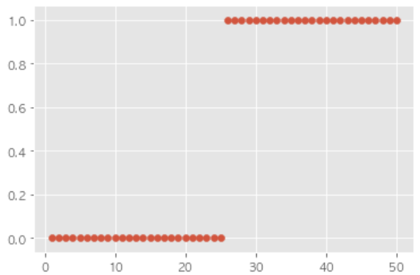 이처럼 데이터가 연속성을 가지지 않기 때문에 데이터가 분리된 형태를 가질 것입니다. 위의 그래프는 제가 설명을 위해 샘플로 뽑은 데이터라 원래 데이터를 그려보면 엄청 깨끗하지 않은 그래프이지만 y값이 0과 1로 똑같이 나뉘겠죠?
