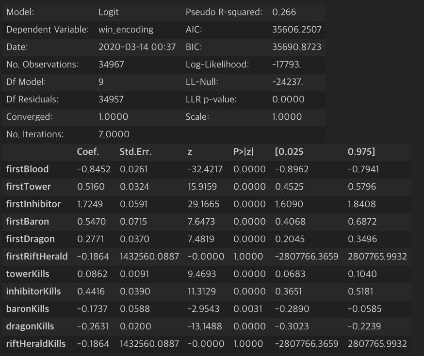 따라서 이번에는 Logistic Regression 을 활용하여 오브젝트 변수들이 승패에 미치는 영향을 분석해보려고 합니다.