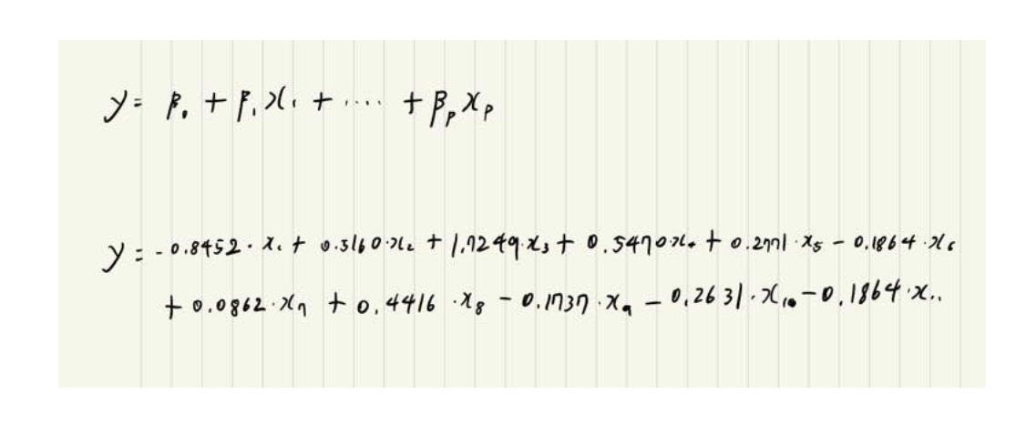 각 변수별 회귀계수(Coefficient)를 회귀식으로 나타낸 것인데요.