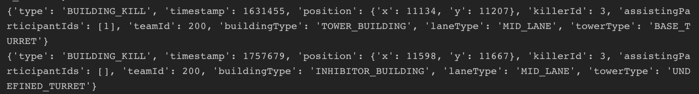 유의해야한다는 것이 예를들어 Building_kill이 있으면 억제기인지, 타워인지, 넥서스인지에 대한 정보를 보여주며, 또한 어느라인(탑, 미드, 봇)의 오브젝트인지에 대한 데이터도 함께 있으므로 구분해서 구축해주셔도 될 것 같습니다. 예를들면 이런식입니다.
