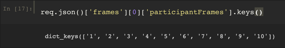 저희가 잘 알다시피 소환사 협곡에 참여하는 유저들은 총 10명으로 아래의 participantFrames로 정보화 되어 있는 유저들도 10명인 것을 확인 가능합니다.