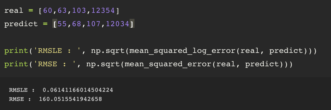 보시는 것처럼 큰 아웃라이어가 값에 포함되더라도 RMSLE의 값은 거의 변화가 없지만 RMSE는 변화폭이 큰 것을 볼 수 있습니다. 따라서 RMSLE는 RMSE에 비해 아웃라이어에 강한 것을 알 수 있습니다.