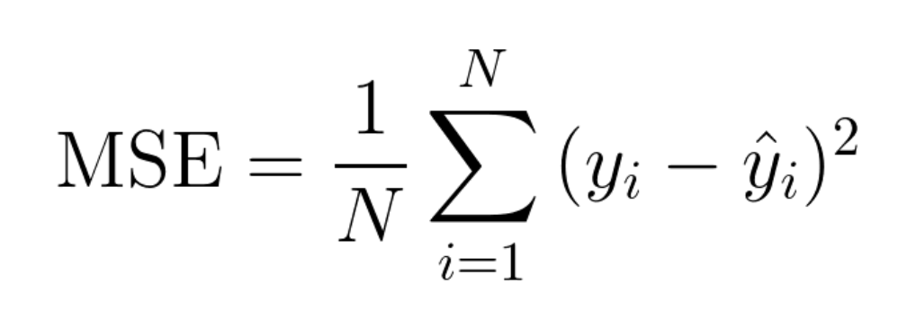 평균 오차 제곱합이라고 불리며 실제값과 오차의 차를 제곱한 뒤 평균을 한 값으로 산출합니다.