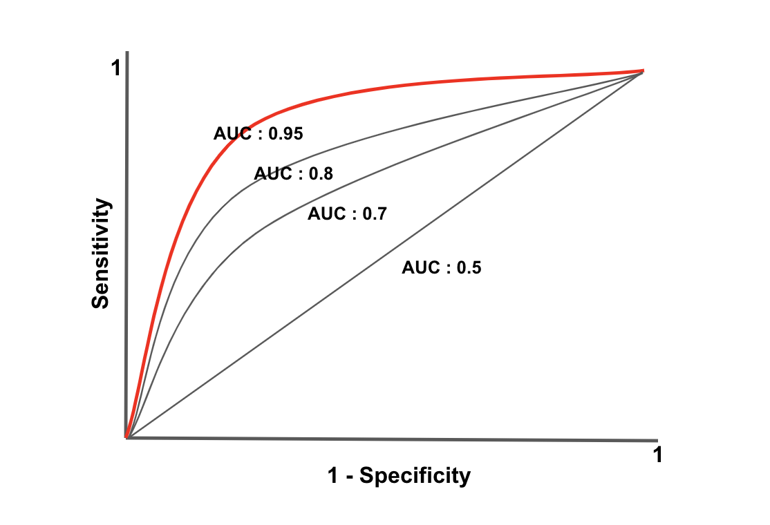 재현도와 1-특이도를 이용하여 ROC-Curve를 그린 뒤 아래 면적으로 AUC를 산출합니다.