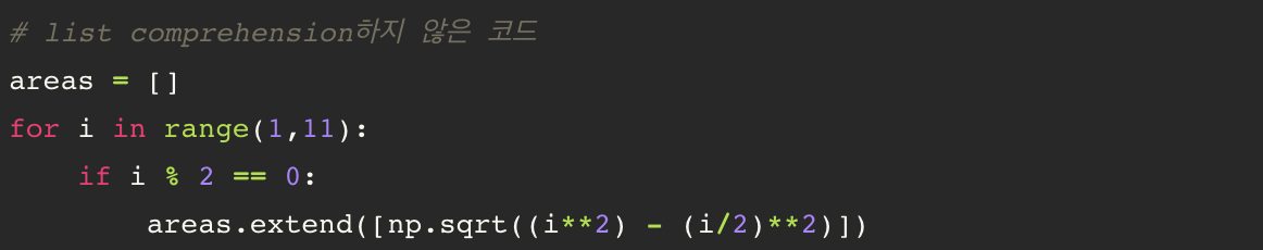이 방법을 알기전엔 list를 만들 때 반복문을 돌려 .append, .extend를 사용해서 생성했지만 list comprehension을 사용하면 코드를 짧고 효율적이게 짤 수 있으며, 속도 측면에서도 이점을 가져올 수 있습니다.