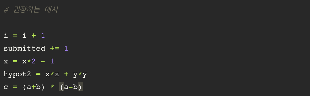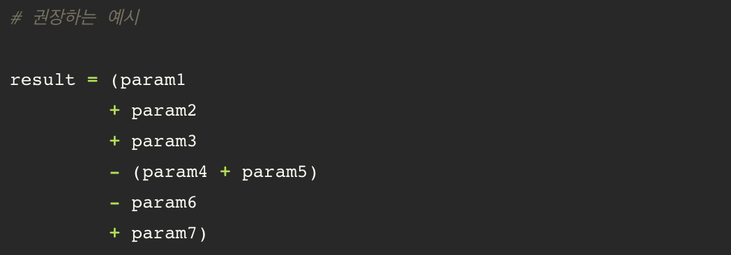 +, - 등의 연산자를 사용할 때는 사용하기 전에 줄바꿈을 하는 것이 좋습니다. 아래의 예시를 보시겠습니다.