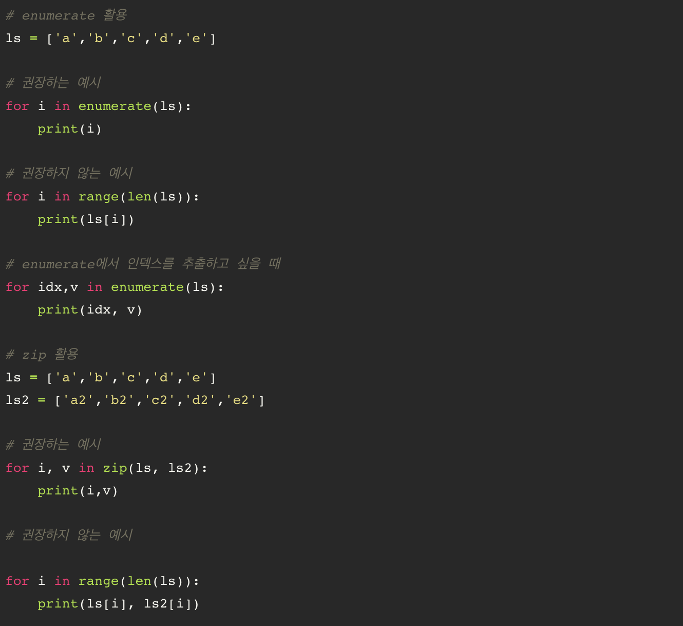 range(len())을 사용하는 것보다 enumerate, zip을 사용하여 인덱스 상태로 데이터를 이용하는 것보다 데이터 자체를 바로 loop문에서 이용하면서 인덱스도 따로 설정이 가능하니 더 효율적으로 코드를 작성할 수 있게 되었습니다.