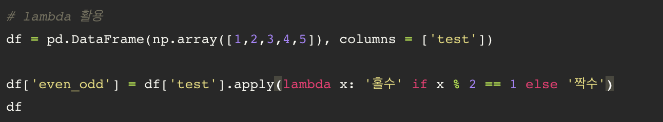 위의 예시는 분석할 때 원하는 파생변수를 생성할 때의 예시인데요. 함수를 만들어서 변수를 생성하는 방법보다 lambda를 활용해서 변수를 생성하는 방식이 굉장히 효율적인 것을 확인할 수 있습니다. 제가 생각하기로 lambda를 활용하는 것을 권장하지 않는 이유가 함수를 범용성이 뛰어나지만 lambda는 범용성이 떨어진다는 이유에서 나온 것이라고 생각이 되는데요.