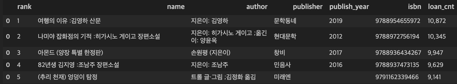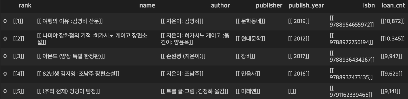 famous_book = pd.DataFrame() for idx, book in enumerate(book_ls): rank = book.select('no') name = book.select('bookname') author = book.select('authors') publisher = book.select('publisher') publish_year = book.select('publication_year') isbn = book.select('isbn13') loan_cnt = book.select('loan_count') famous_book0 = pd.DataFrame({'rank' : [rank] ,'name' : [name] ,'author' : [author] ,'publisher' : [publisher] ,'publish_year' : [publish_year] ,'isbn' : [isbn] ,'loan_cnt' : [loan_cnt]}) famous_book = famous_book.append(famous_book0)이렇게 해주시면 아래와 같은 데이터프레임이 만들어집니다.