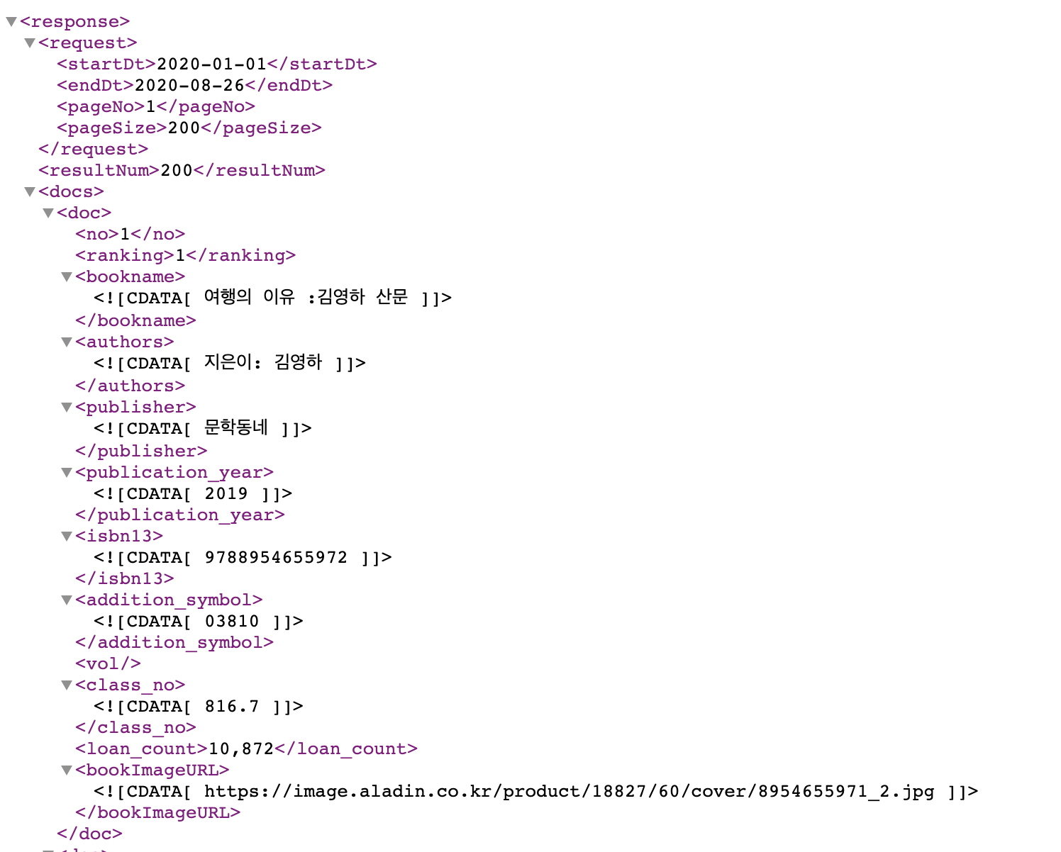 api_key = my_api base_url = 'http://data4library.kr/api/loanItemSrch?authKey={}&startDt=2020-01-01&endDt=2020-08-26' req = requests.get(base_url.format(api_key))데이터는 이런식으로 구조화 되어 있습니다.