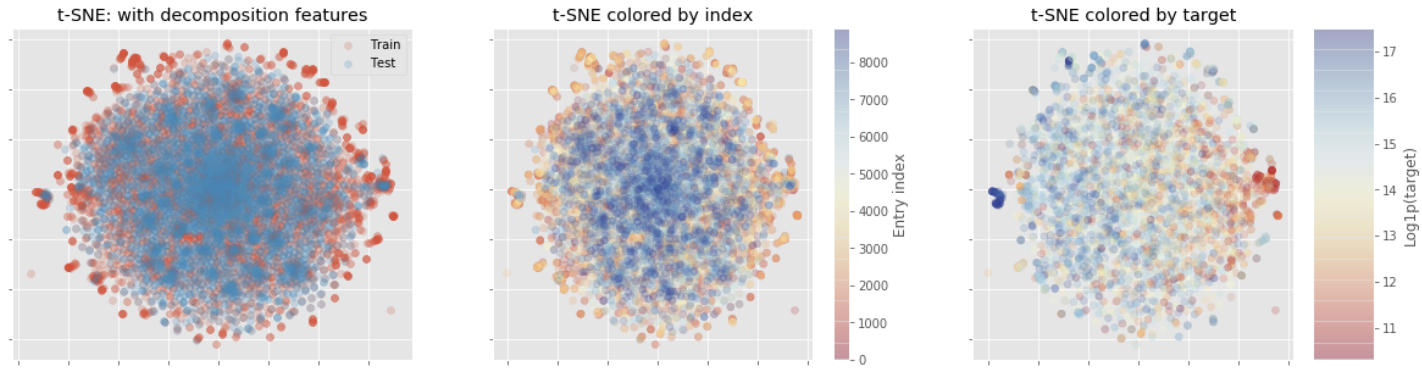 COMPONENTS = 20 cm = plt.cm.get_cmap('RdYlBu') # List of decomposition methods to use methods = [ TruncatedSVD(n_components=COMPONENTS), PCA(n_components=COMPONENTS), FastICA(n_components=COMPONENTS), GaussianRandomProjection(n_components=COMPONENTS, eps=0.1), SparseRandomProjection(n_components=COMPONENTS, dense_output=True) ] # Run all the methods embeddings = [] for method in methods: name = method.__class__.__name__ embeddings.append( pd.DataFrame(method.fit_transform(total_df), columns=[f"{name}_{i}" for i in range(COMPONENTS)]) ) print(f">> Ran {name}") # Put all components into one dataframe components_df = pd.concat(embeddings, axis=1) # Prepare plot _, axes = plt.subplots(1, 3, figsize=(20, 5)) # Run t-SNE on components tsne_df = test_tsne( components_df, axes[0], title='t-SNE: with decomposition features' ) # Color by index sc = axes[1].scatter(tsne_df[:, 0], tsne_df[:, 1], alpha=0.2, c=range(len(tsne_df)), cmap=cm) cbar = fig.colorbar(sc, ax=axes[1]) cbar.set_label('Entry index') axes[1].set_title("t-SNE colored by index") axes[1].xaxis.set_major_formatter(NullFormatter()) axes[1].yaxis.set_major_formatter(NullFormatter()) # Color by target sc = axes[2].scatter(tsne_df[train_idx, 0], tsne_df[train_idx, 1], alpha=0.2, c=np.log1p(train_df.target), cmap=cm) cbar = fig.colorbar(sc, ax=axes[2]) cbar.set_label('Log1p(target)') axes[2].set_title("t-SNE colored by target") axes[2].xaxis.set_major_formatter(NullFormatter()) axes[2].yaxis.set_major_formatter(NullFormatter()) plt.axis('tight') plt.show()