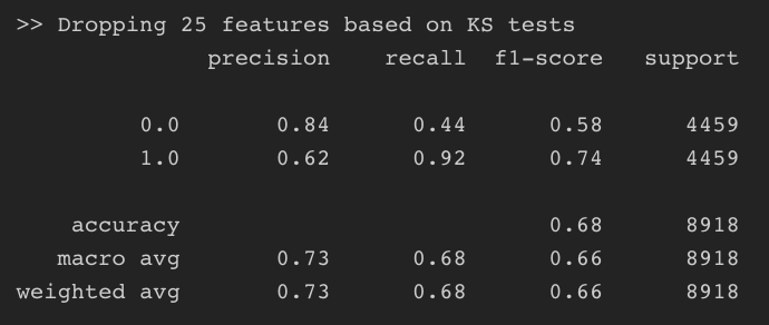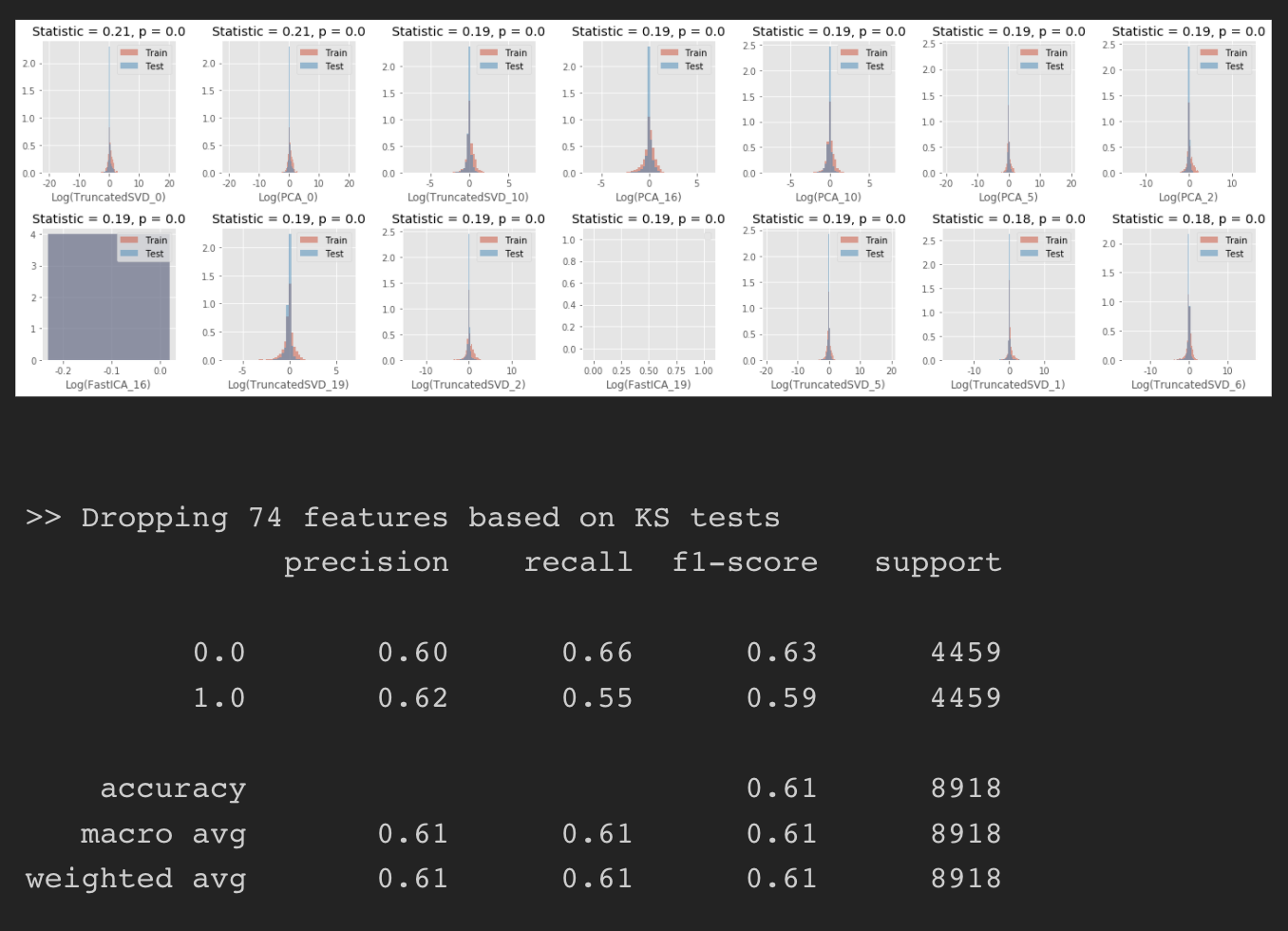 # 통계분석을(유의확률 비교) 통해 분포가 다르다고 도출되는 변수들을 제거했을 때 print(f">> Dropping {len(diff_df)} features based on KS tests") test_prediction( total_df.drop(diff_df.feature.values, axis=1) )