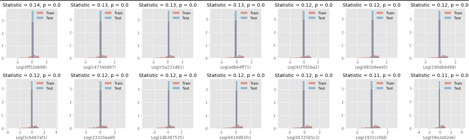 def get_diff_columns(train_df, test_df, show_plots=True, show_all=False, threshold=0.1): """Use KS to estimate columns where distributions differ a lot from each other""" # Find the columns where the distributions are very different diff_data = [] for col in tqdm(train_df.columns): statistic, pvalue = ks_2samp( train_df[col].values, test_df[col].values ) if pvalue <= 0.05 and np.abs(statistic) > threshold: diff_data.append({'feature': col, 'p': np.round(pvalue, 5), 'statistic': np.round(np.abs(statistic), 2)}) # Put the differences into a dataframe diff_df = pd.DataFrame(diff_data).sort_values(by='statistic', ascending=False) if show_plots: # Let us see the distributions of these columns to confirm they are indeed different n_cols = 7 if show_all: n_rows = int(len(diff_df) / 7) else: n_rows = 2 _, axes = plt.subplots(n_rows, n_cols, figsize=(20, 3*n_rows)) axes = [x for l in axes for x in l] # Create plots for i, (_, row) in enumerate(diff_df.iterrows()): if i >= len(axes): break extreme = np.max(np.abs(train_df[row.feature].tolist() + test_df[row.feature].tolist())) train_df.loc[:, row.feature].apply(np.log1p).hist( ax=axes[i], alpha=0.5, label='Train', density=True, bins=np.arange(-extreme, extreme, 0.25) ) test_df.loc[:, row.feature].apply(np.log1p).hist( ax=axes[i], alpha=0.5, label='Test', density=True, bins=np.arange(-extreme, extreme, 0.25) ) axes[i].set_title(f"Statistic = {row.statistic}, p = {row.p}") axes[i].set_xlabel(f'Log({row.feature})') axes[i].legend() plt.tight_layout() plt.show() return diff_df # Get the columns which differ a lot between test and train diff_df = get_diff_columns(total_df.iloc[train_idx], total_df.iloc[test_idx])