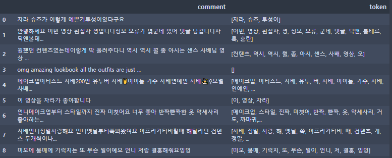 comment_result = [] for i in comment_list: tokens = re.sub(emoji_pattern,"",i) tokens = re.sub(han,"",tokens) comment_result.append(tokens) comment_result = pd.DataFrame(comment_result, columns=["comment"])