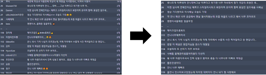 텍스트 전처리 전/후 보시다시피 텍스트가 훨씬 간결해지고 보기 좋게 변한 것을 알 수 있습니다.