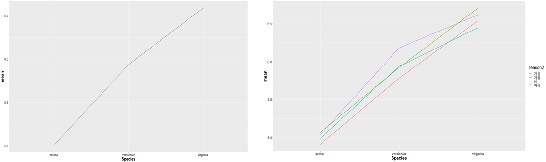 #line plot library(dplyr) line_data <- data %>% group_by(Species) %>% summarise(mean = mean(Sepal.Length)) ggplot(line_data,aes(x=Species,y=mean,group=1))+ geom_line() #범례를 추가하여 그래프를 그리고 싶다면? line_data <- data %>% group_by(Species,season2) %>% summarise(mean = mean(Sepal.Length)) ggplot(line_data,aes(x=Species,y=mean,col=season2,group=season2))+ geom_line(size=1)