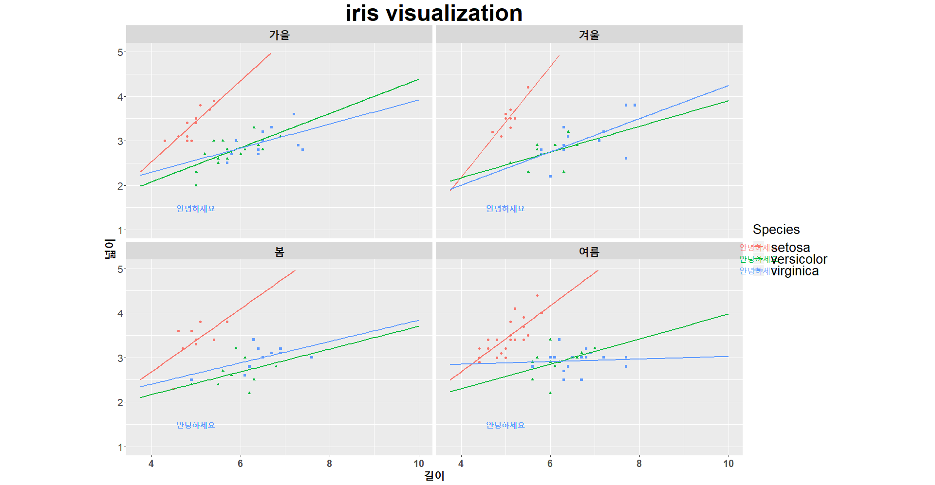 #facet_grid/wrap설명하기 위해서 season변수 생성 iris$season <- sample(x=1:4,size=150,replace = T) iris$season2 <- ifelse(iris$season==1,"봄", ifelse(iris$season==2,"여름", ifelse(iris$season==3,"가을","겨울"))) iris$season2 <- as.factor(iris$season2) data<- iris library(ggplot2) #시각화 시작 ggplot(data,aes(Sepal.Length,Sepal.Width,col=Species,shape=Species))+ geom_point()+ ggtitle('iris visualization')+ xlab('길이')+#x축 제목 ylab('넓이')+#y축 제목 coord_fixed()+ #x축y축 비율 1:1설정 #coord_flip() - x축y축 transpose #geom_hline(yintercept = mean(data$variable),col="#FF6600",cex=0.9) #geom_vline(xintercept = mean(data$variable),col="#FF6600",cex=0.9) scale_y_continuous(limits=c(1, 5))+ # = ylim #scale_y_continuous(breaks = c(a,b,c,d))로 축을 임의로 지정할 수 있음 scale_x_continuous(limits=c(3.75,10))+ # = xlim facet_wrap(~season2)+ # 그래프르 격자형식으로 지정하기 geom_smooth(method=lm, fullrange=TRUE,se=F)+#추세선 그리기 geom_text(x=5,y=1.5,label = '안녕하세요',size = 5)+#원하는 곳에 text삽입 theme(plot.title = element_text(size = 35, hjust=0.5,family = "Tahoma", face = "bold"), text = element_text(size = 20, family = "Tahoma"), axis.title = element_text(face="bold"), axis.text.x=element_text(size = 15,face="bold"), legend.title=element_text(size=20), legend.text=element_text(size=20), strip.text.x = element_text(size = 20, face="bold"))