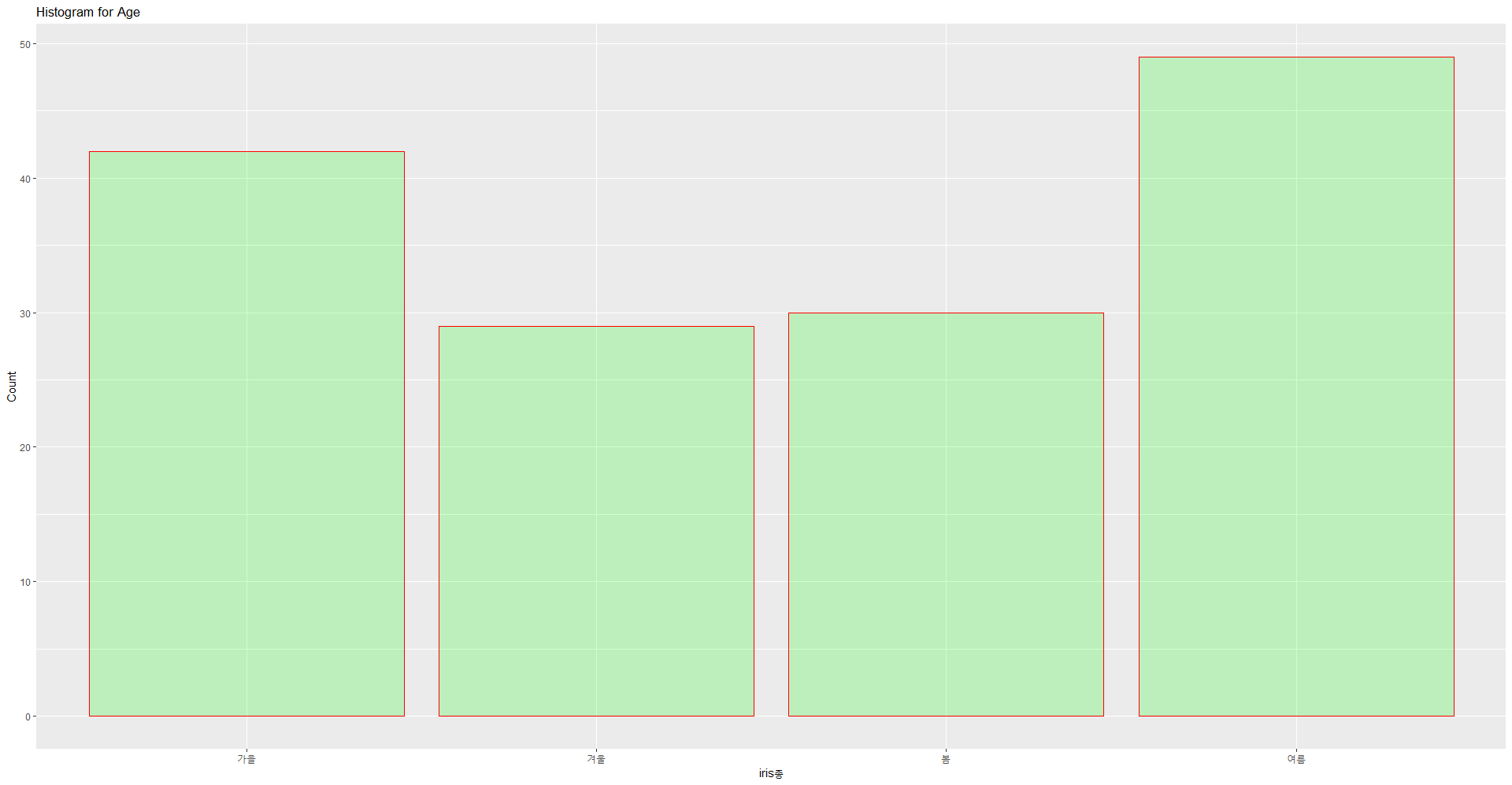 #히스토그램 ggplot(data, aes(data$season2)) + geom_histogram(stat = 'count',col="red", fill="green", alpha = .2) + labs(title="Histogram for Age") + labs(x="iris종", y="Count") table(data$season2)