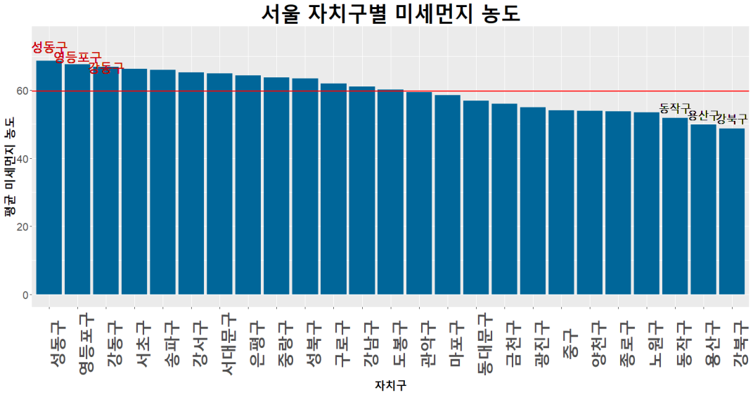 ggplot(dust2,aes(x=reorder(name,-dustmean),y=dustmean))+ geom_bar(size=1,stat = "identity",fill='#006699')+ scale_y_continuous(name = "평균 미세먼지 농도", limits=c(0, 75))+ scale_x_discrete(name = "자치구") + ggtitle("서울 자치구별 미세먼지 농도") + theme(axis.text.x=element_text( angle=90))+ theme(plot.title = element_text(size = 35, hjust=0.5,family = "Tahoma", face = "bold"), text = element_text(size = 20, family = "Tahoma"), axis.title = element_text(face="bold"), axis.text.x=element_text(size = 30,face="bold"), legend.title=element_text(size=20), legend.text=element_text(size=20))+ geom_text(x=3,y=67,label="강동구",size=8,col="#CC0000")+ geom_text(x=1,y=73,label="성동구",size=8,col="#CC0000")+ geom_text(x=2,y=70,label="영등포구",size=8,col="#CC0000")+ geom_text(x=25,y=52,label="강북구",size=7)+ geom_text(x=23,y=55,label="동작구",size=7)+ geom_text(x=24,y=53,label="용산구",size=7)+ geom_hline(yintercept = mean(dust2$dustmean),col="red",cex=0.9)