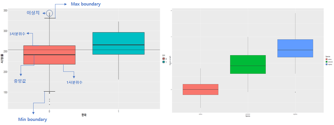 Box plot를 통해서 요약치를 확인하는 방법은 그래프에 표시를 해두겠습니다.